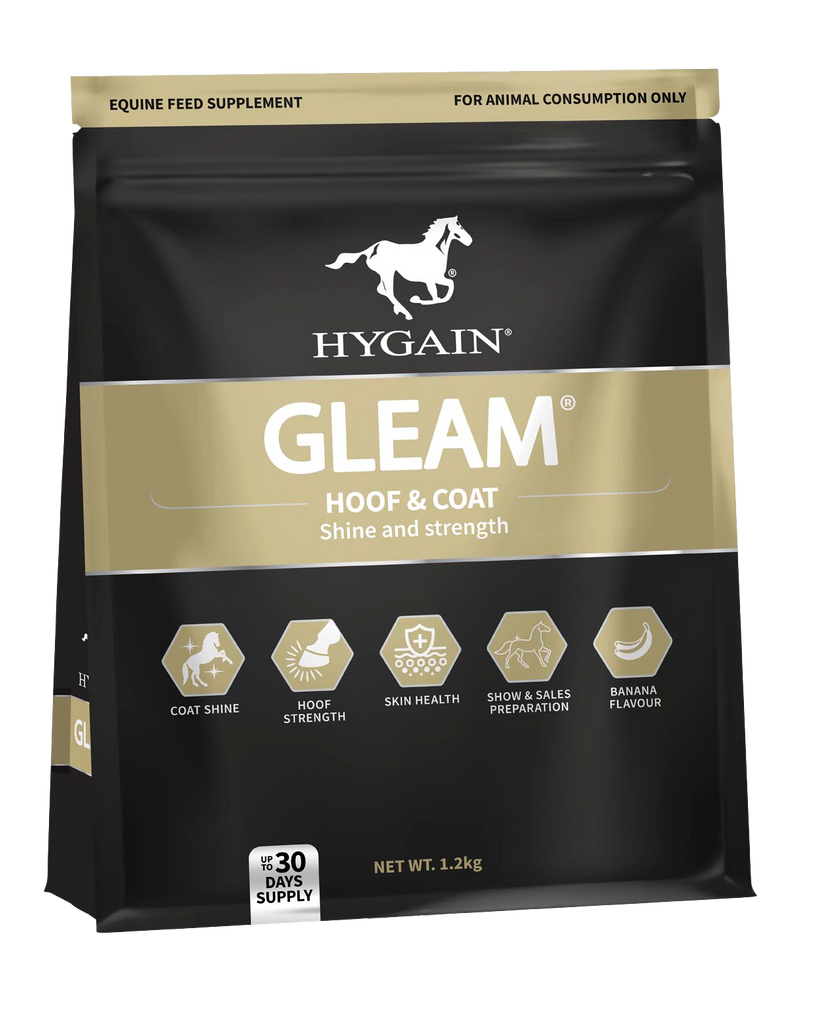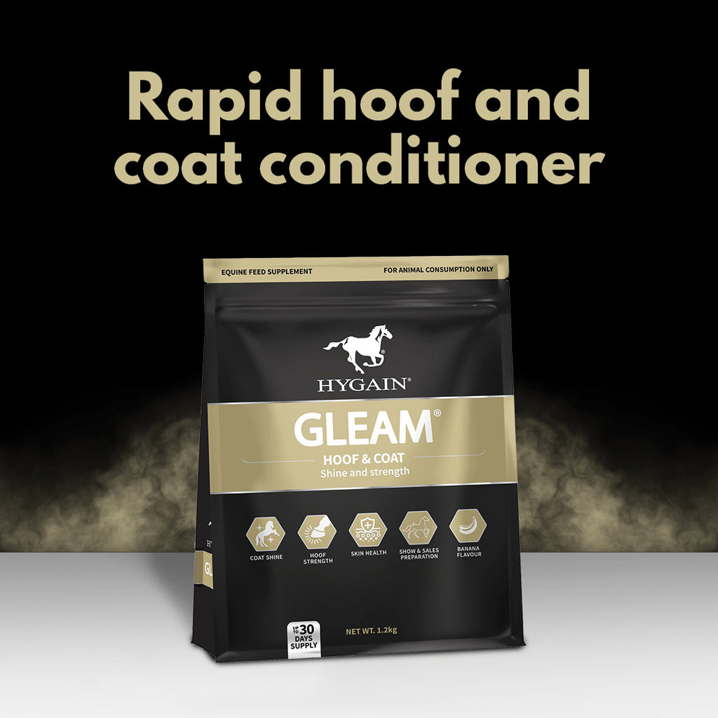 HYGAIN® GLEAM®, rapid hoof and coat conditioner is a blend of biotin, bio-chelated zinc, quality amino acids, full fat soya bean meal and essential fatty acids formulated in a palatable banana flavoured base for all equines.
