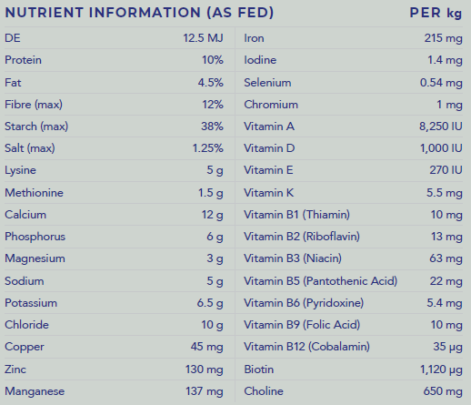 Cooked and Steam Flaked Oats, Micronized Barley, Micronized Lupins, Micronized Maize, Lucerne Chaff, Molasses, Calcium Carbonate, Dicalcium Phosphate, Potassium Chloride, Salt, Hygain® Vitamin and Mineral Premix (Including Heat Stable Vitamins and Chelated Mineral Proteinates) & Bio-Available Chromium.