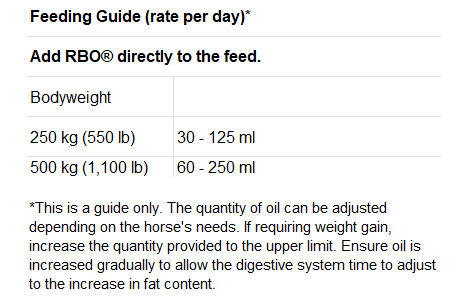 Pure Rice Bran Oil, Natural Vitamin E, Omega 3, 6 and 9 essential fatty acids and primary antioxidants formulated for all equines. The increases energy content of diet without fizz reduces excitability, increases oxidative capacity in performance horses and acts as a carrier for fat-soluble vitamins.