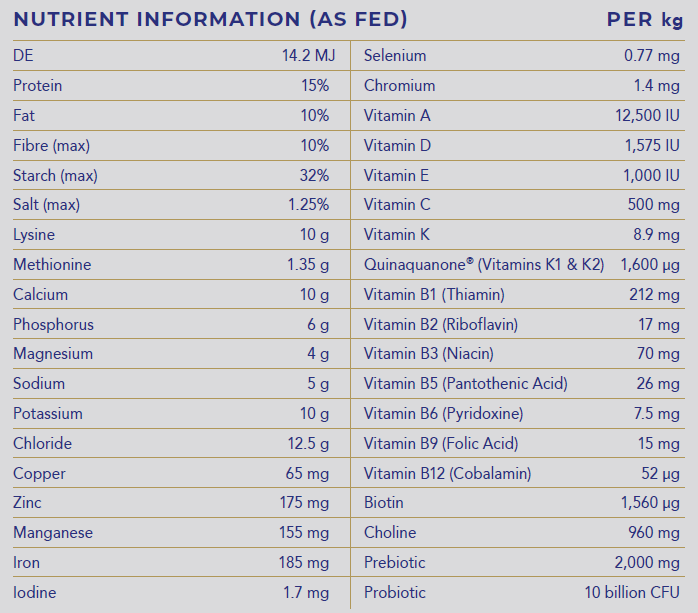Micronized Barley, Micronized Beans, Micronized Lupins, Micronized Maize, Sunflower Seeds, Canola Oil, Rice Bran Oil, Molasses, Calcium Carbonate, Dicalcium Phosphate, Magnesium Oxide, Potassium Chloride, Salt, Hygain® Vitamin and Mineral Premix (Including Heat Stable Vitamins and Chelated Mineral Proteinates), Lysine, Bio-Available Chromium, Vitamin C, Prebiotics, Probiotics & Quinaquanone® (Constituent of Bonafide®).