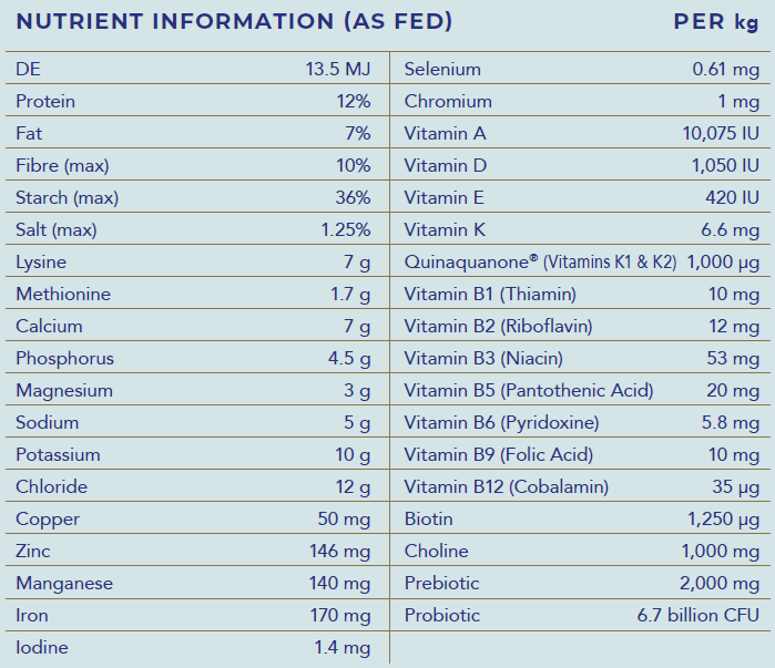 Cooked and Steam Flaked Oats, Micronized Barley, Micronized Lupins, Micronized Maize, Sunflower Seeds, Canola Oil, Rice Bran Oil, Molasses, Calcium Carbonate, Dicalcium Phosphate, Potassium Chloride, Salt, Hygain® Vitamin and Mineral Premix (Including Heat Stable Vitamins and Chelated Mineral Proteinates), Bio-Available Chromium, Prebiotics, Probiotics & Quinaquanone® (Constituent of Bonafide®).