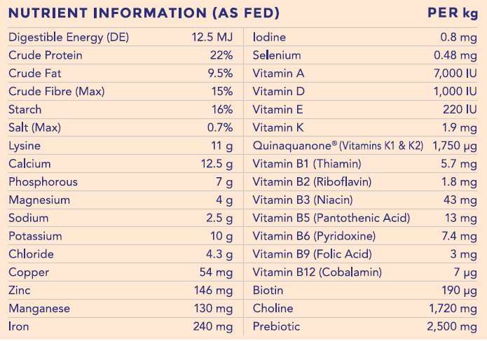 Protein Meals, Lucerne Meal, Bran, Pollard, Cereals, Canola Oil, Rice Bran Oil, Calcium Carbonate, Salt, Hygain® Vitamin and Mineral Premix (Including Heat Stable Vitamins and Chelated Mineral Proteinates), Prebiotics & Quinaquanone® (Constituent of Bonafide®, Bio-Available Vitamins K1 & K2).